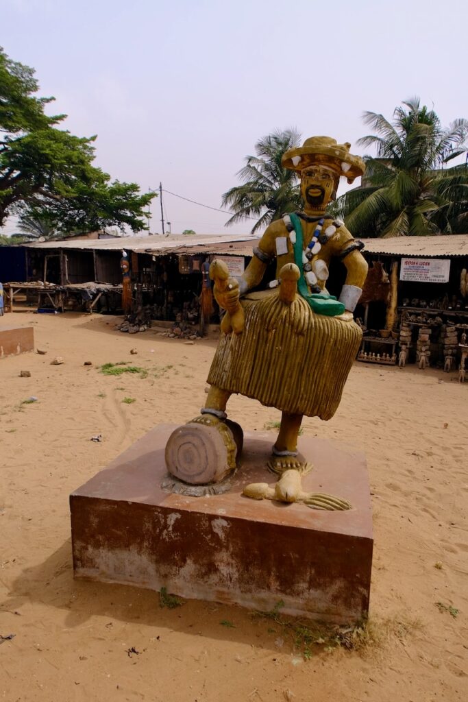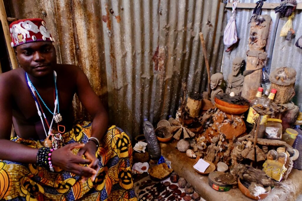After we had seen the animals, voodoo masks, dolls and souvenirs, it was time to sit with the voodoo priest. We were walked into a dark room behind a shop and introduced to them. There were lots of nicknacks on his floor and he had an interesting shrine with lots of objects on it, including, funnily enough, two empty bottles of whisky. Maybe that helps with the authenticity! One of the gods outside was the ‘4 x penis god’, god of fertility. I asked the voodoo priest what the earthy lump was underneath an upside down tortoise shell with power and an egg in it, and he said it was the real fertility god. Interesting, and frankly quite intimidating to be in the presence of a real god.