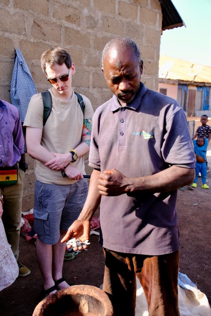 We then headed to a local village where we were shown traditional shea butter making, given a big list of cancers it cures along with pretty much any other ailment, and naturally any skin condition. We were unfortunately, as happens frequently on these trips, distracted by the local animals. If you want us to remain focused you shouldn’t include chickens, donkeys, cats or goats. It’s impossible to listen to you if you have animals running around. We might have missed our chance to purchase the shea butter, but with a little help from a random auntie, we managed to buy two in the end.