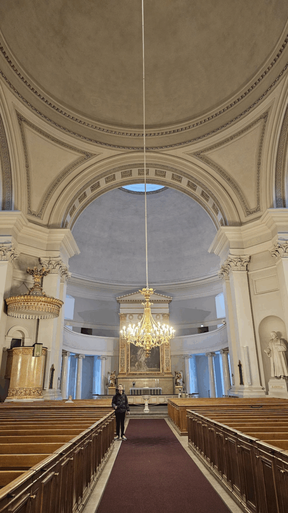We spotted Kauppahalli Saluhall on our way so walked through, hoping to see an outdoor market, some interesting restaurants and different cuisines, but with it being the start of winter, and still early-ish on a Sunday, not many things were open and there were no stalls outside at all. After this brief visit, we first found ourselves in Punavuori district, then we walked on to St John’s Church (Johanneksenkirkko) where we took photos of the local wildlife – sparrows, blue tits, pigeons and crows before peeking into the church through the inside glass doors where a live sermon was taking place.